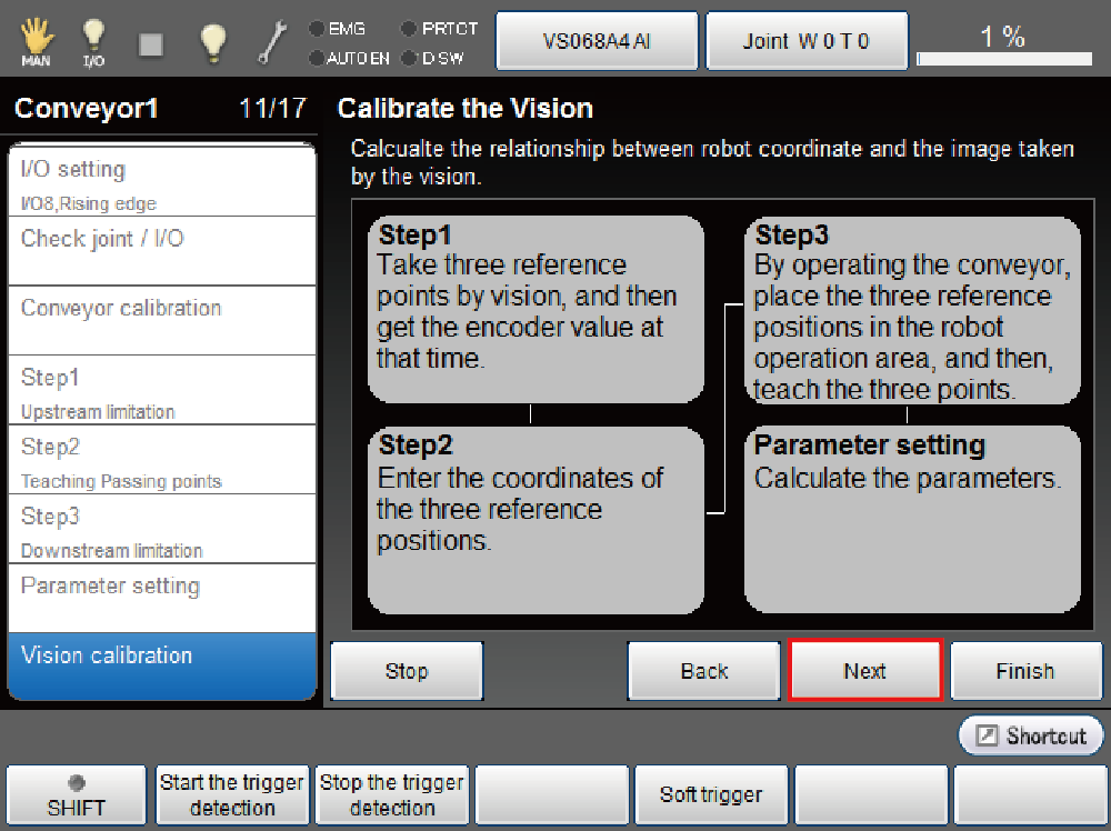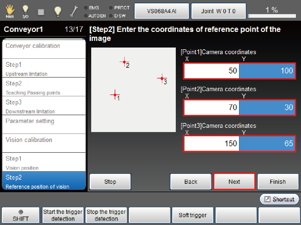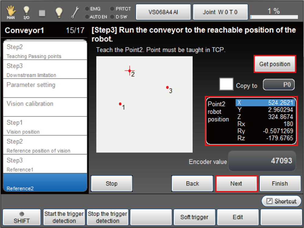 - Move back the reading position of reference point 1 in the opposite of the conveyor vector direction to get the vision sensor detection position.