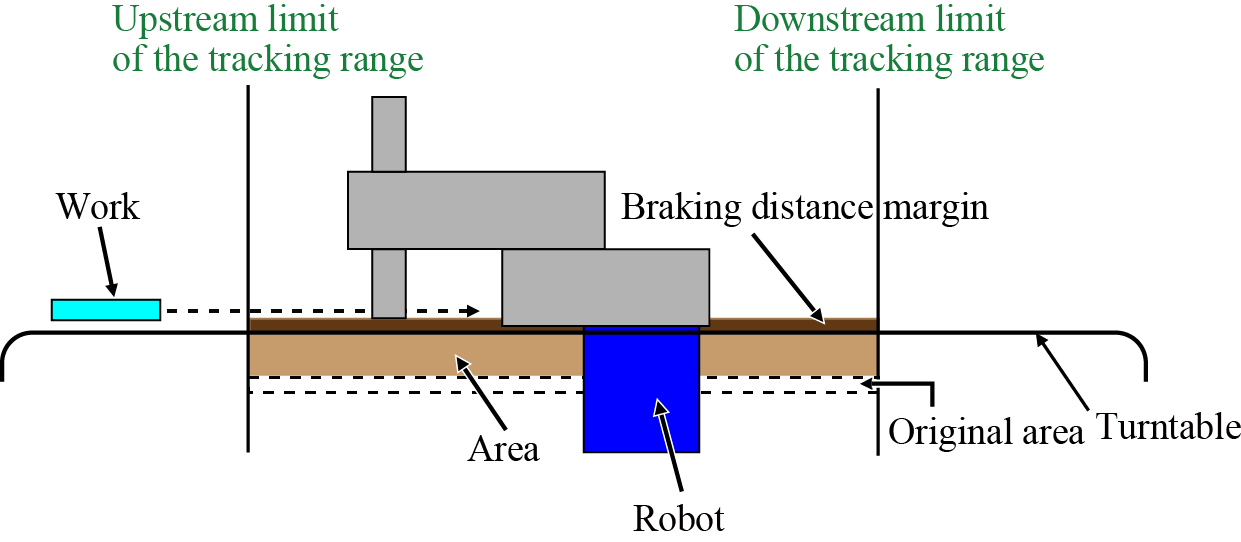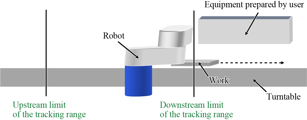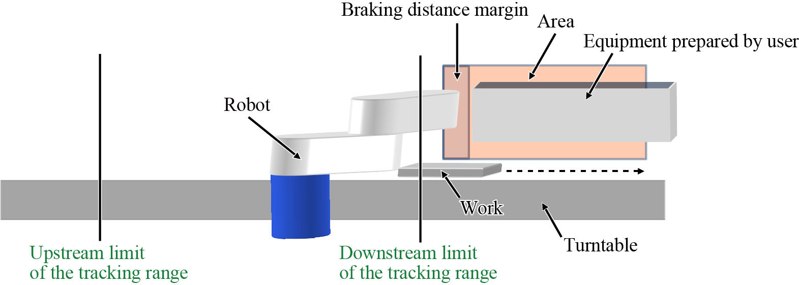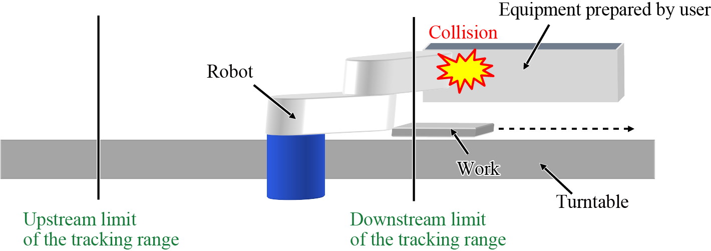 Please pay attention to avoid collisions with equipments placed behind the Downstream limit of the tracking range. It is recommended to perform collision check by using Area function to prevent unintended contact between robot and equipments.
