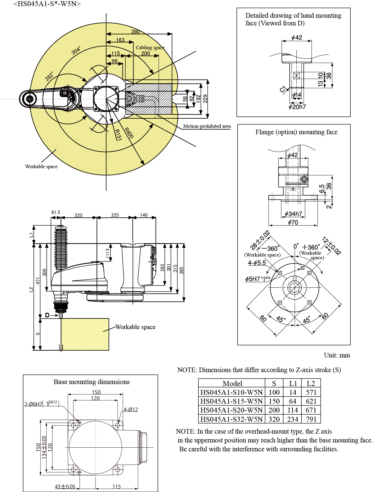 Outer Dimensions and Workable Space of the Robot Unit