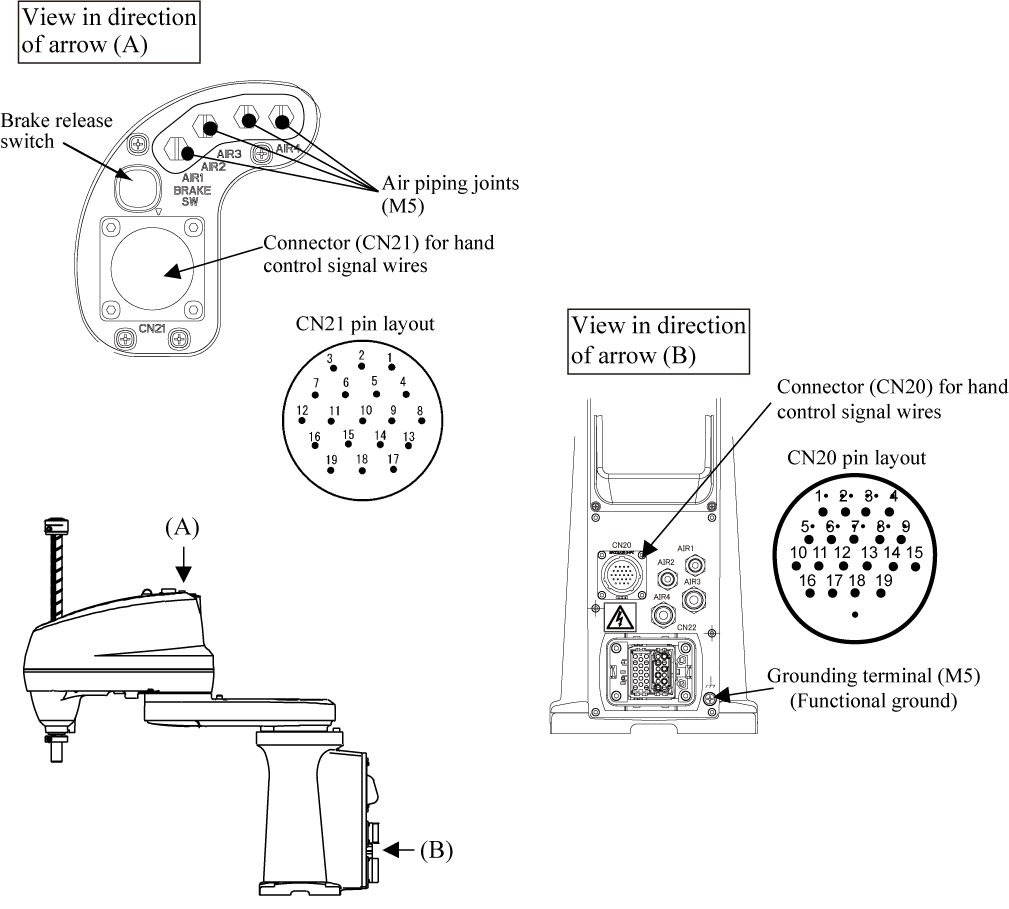 Note 1: Pins #1 to #19 on CN21 and those on CN20 are connected with each other. The maximum rated current per line is 1A. Note 2: Use the attached connector set for CN20 and CN21. |