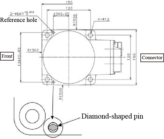 According to the dimensions specified in the figure below, drill four robot fixing holes and two dowel pin holes in the robot mount where the robot unit is to be anchored.