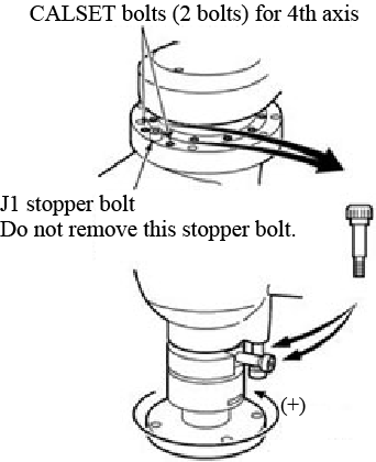 | 4th axis | Turning end in the positive direction (counterclockwise end when viewed from the top) To CALSET the 4th axis, two CALSET bolts mounted on the robot unit are required. After completion of CALSET, put the CALSET bolts back into place. (See the figure below.) |