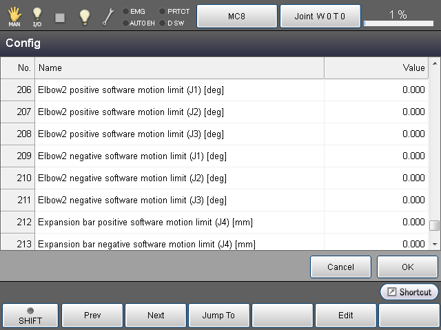 | 211 | Elbow 2 negative software motion limit (J3)[deg] |