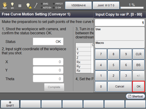 On the teach pendant window, pressing the variable number button will display the numeric keypad of [Input Copy to var P.]. Enter the number and press [OK].