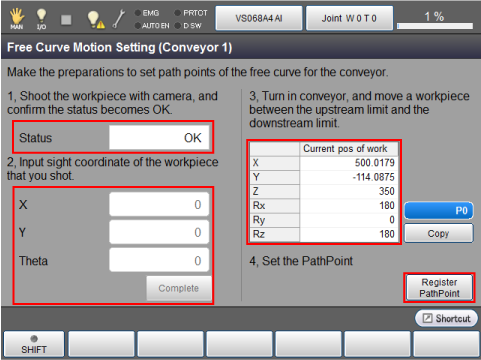 Press [Free curve motion] button of the conveyor to execute the free curve interpolation.
