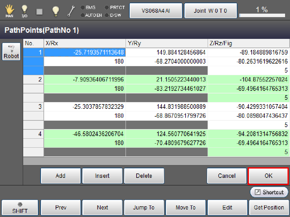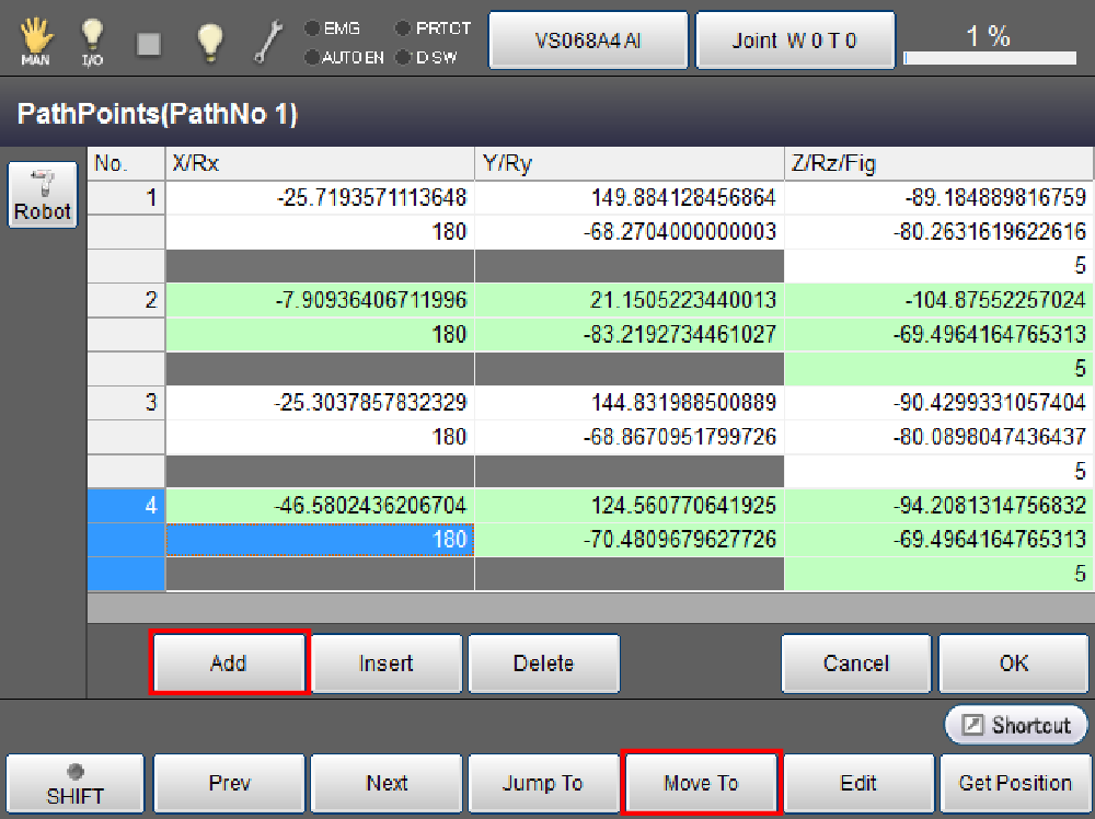 Move the robot to the teaching position on the [PathPoints] screen and press [Add].