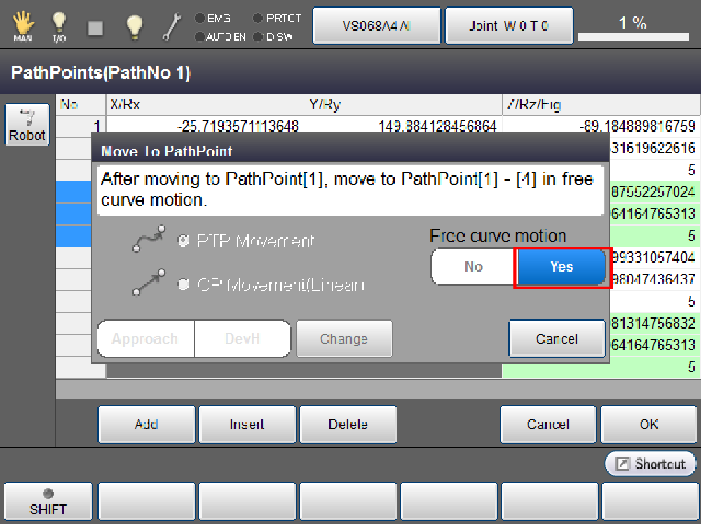 After moving to the path point [1], the robot passes through all the specified path points by free curve interpolation. Keep pressing OK key while pressing deadman switch.