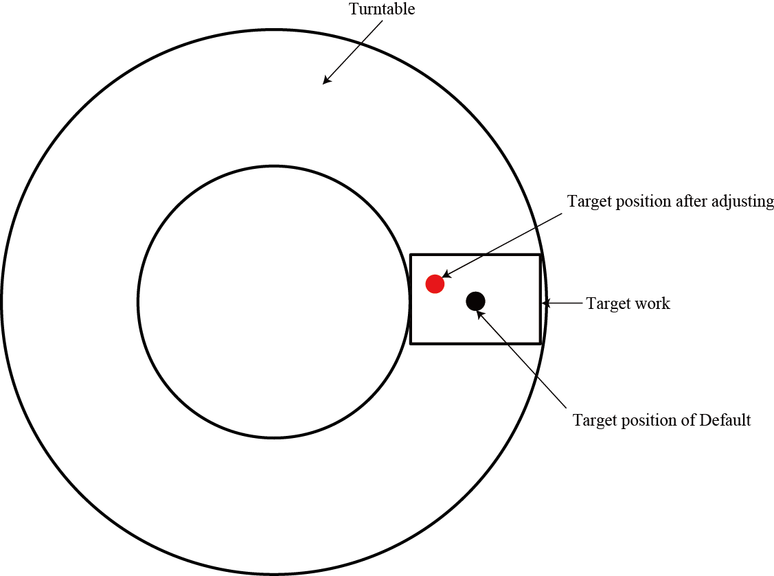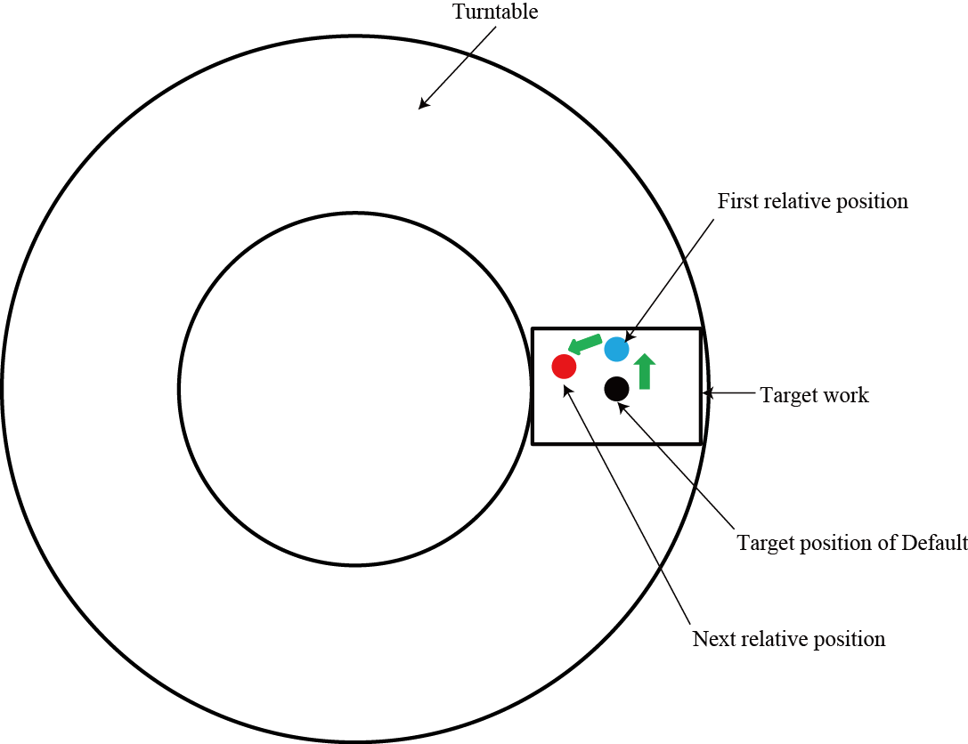 This exemplifies that a robot moves the target position of Default by using TrackMove and moves 5mm to the tangential direction of turn table by using TrackDraw. Then the robot moves 10mm offset point towards the vector jointing the center of turntable by using TrackDraw.