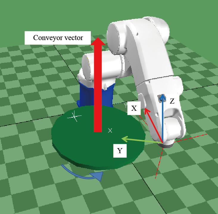 When adjust the target position or execute the relative motion while the circular tracking is operating, specify the offset value with the command of TrackShiftTarget or TrackDraw. This offset value at that time can be specified in the conveyor coordinates.