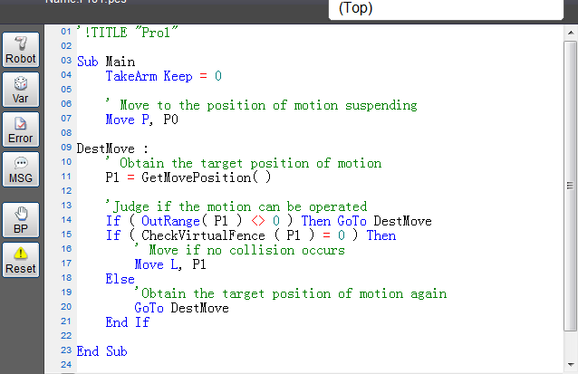 When operating the robot, if the function of VirtualFence detect the possibility of the collision between the robot and equipment, an error occurs and the robot will stop. However, CheckVirtualFence command can check the collision between robot and equipment at the target position without operating the robot; programming by the non-stop operation of the robot is possible.