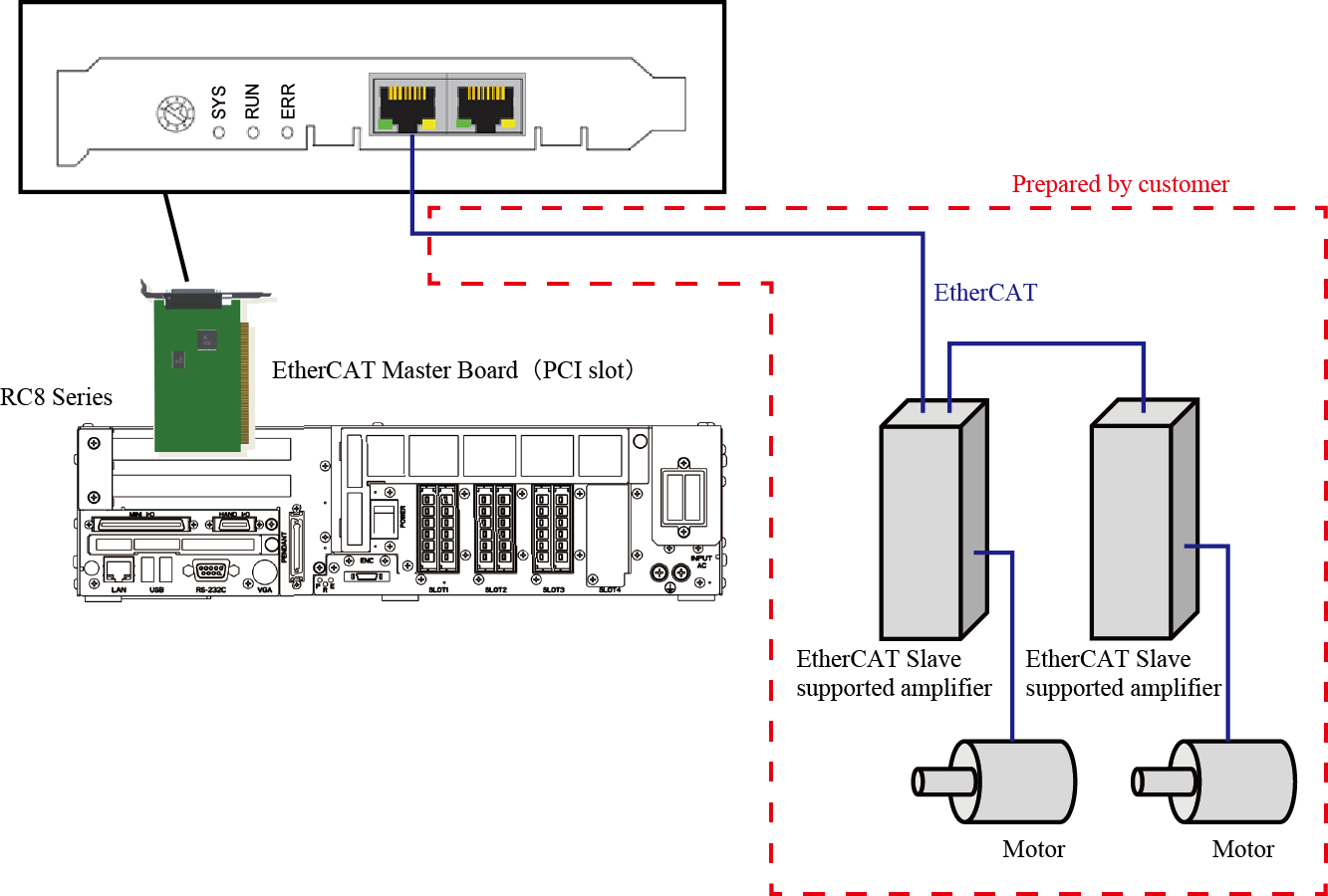EtherCAT communication needs to install EtherCAT master board on PCI slot of RC8 series controller. To enable its function, "Selective Extended Joint(EtherCAT)" License (non-free) is also needed.