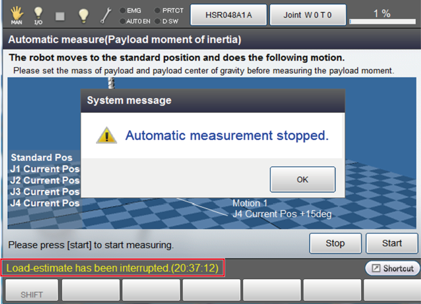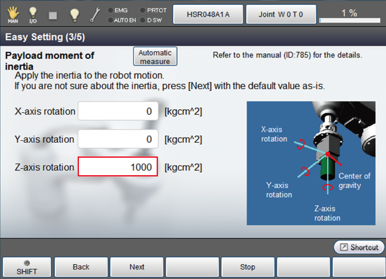 | 3 | Ensure that if pressed "Cancel" in the window of Automatic measurement and the window returns to [Easy Setting] - [Mass of payload], the measurement value cannot be inputted. |