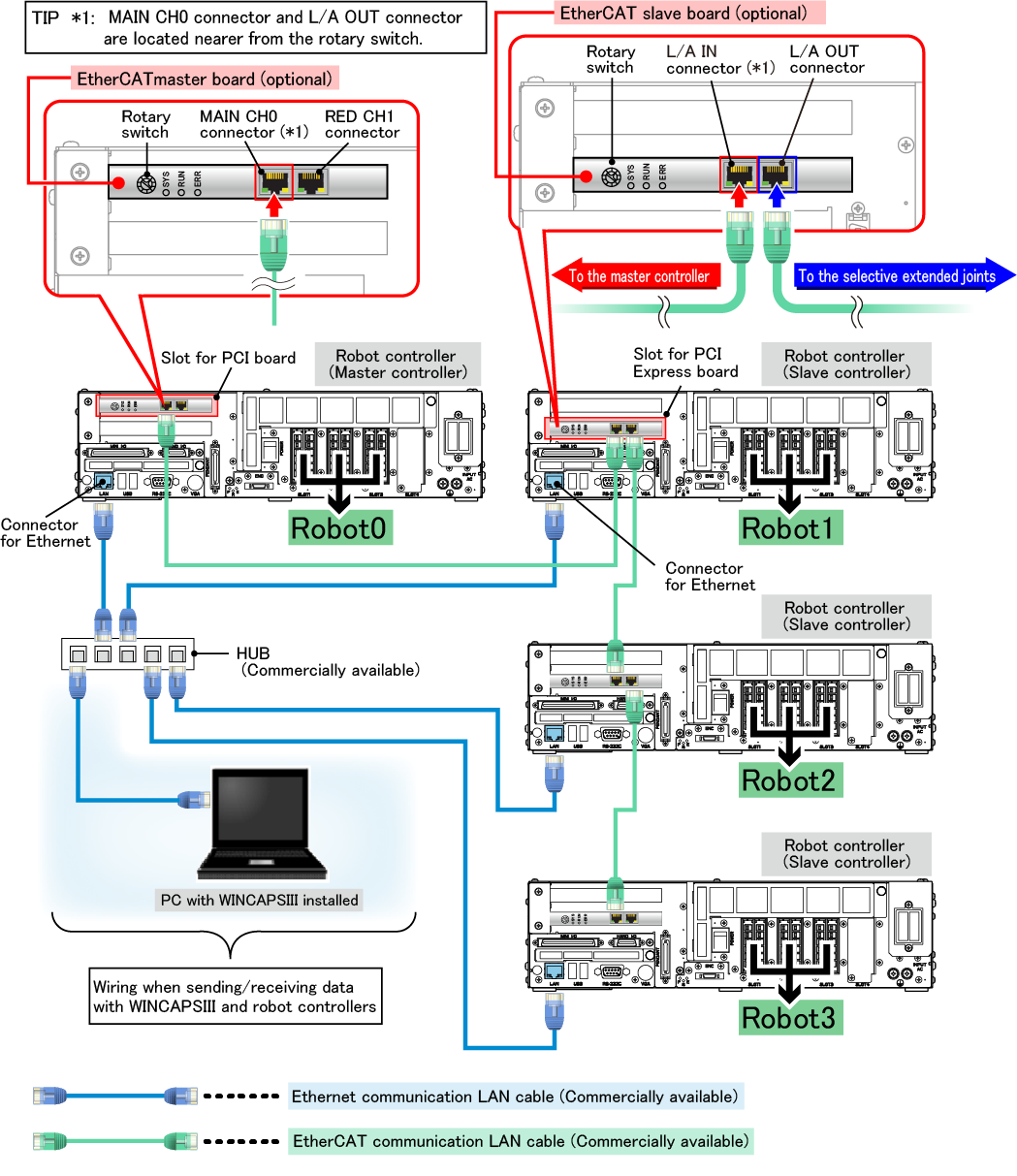 When the system for the cooperative control function is adjusted, data is sent/received between WINCAPSIII and a master controller, and also between WINCAPSIII and a slave controller as well. In this case, a PC with WINCAPSIII installed and the master and slave controllers must be all connected. Therefore, wire them as shown above. |