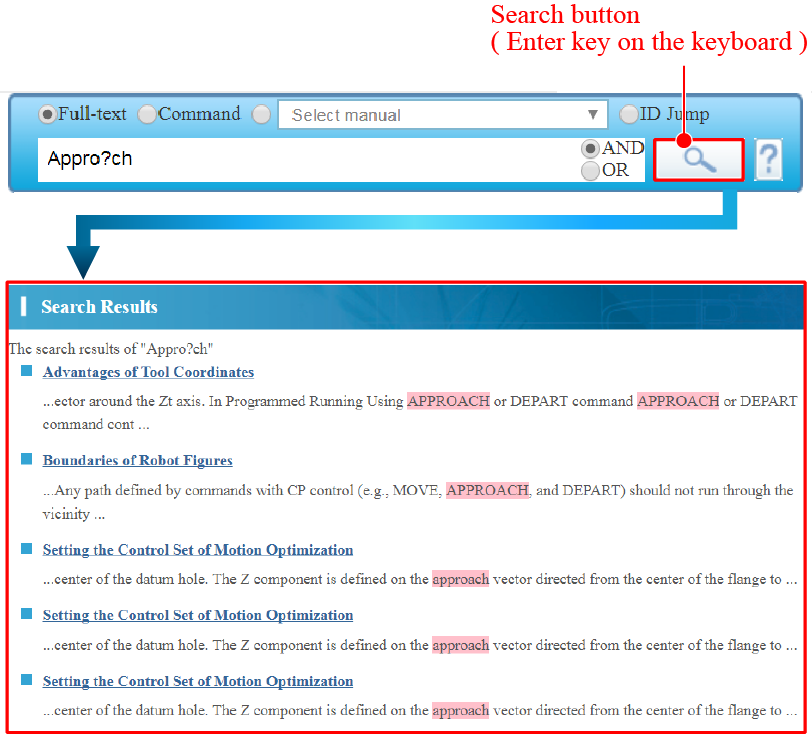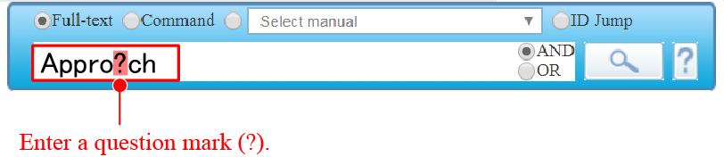 For example, if you are uncertain about a part of spelling of "Approach" command, and think the correct spell is either "Approach" or "Approoch", you can enter "Appro?ch" to search. The search returns contents that include "Appro?ch" which question mark represents any single character.