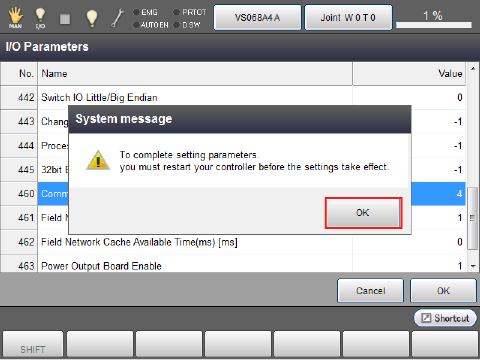 Once the parameter setting has been finished, the following system message appears. Press [OK] to reboot the robot controller.
