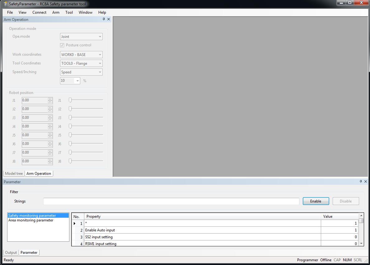 Safety parameters can be referred from the RC8A Safety parameter tool by importing safety parameters from the robot controller to your computer with WINCAPSIII.