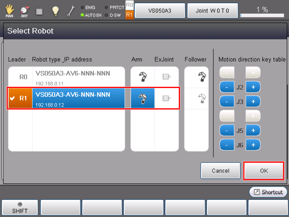 On the top of the window, press [Select Robot]. Press [R1], and then press [OK] to assign Robot1 as a leader.