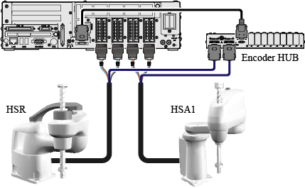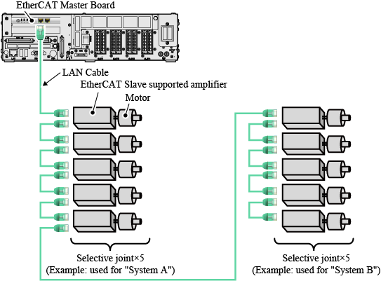 This function also can be applied to the MC8 series motion controller (hereafter, MC8 series). With this function, one MC8 series can control two robots.