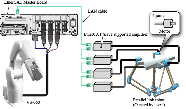 The following example shows the coordination between an RC8 series-connected 6-axis robot and an MC8 series-connected 4-axis robot (parallel link robot). In this example, the MC8 series can easily control the parallel link robot by using the kinematics function.
