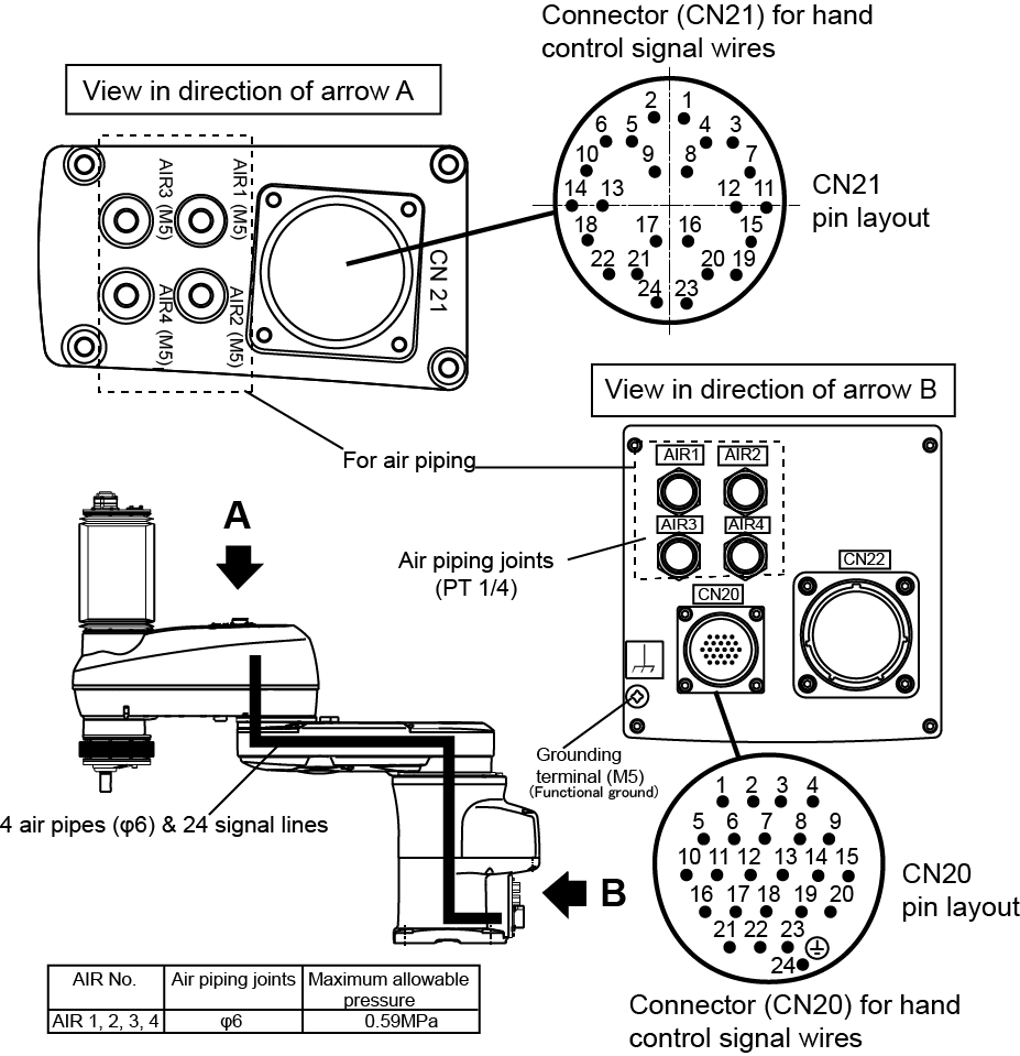 Note 1: Pins #1 to #24 on CN21 and those on CN20 are connected with each other. The maximum rated current per line is 1A. Note 2: Use the attached connector set for CN20 and CN21. |