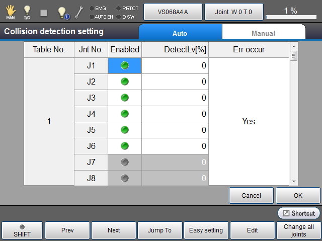 | [F6 Change all joints] | Once the system message appears, on the [Col Detect] selection, select [ON] or [OFF]. Click [OK] to confirm. [ON] : All axes are enabled. |