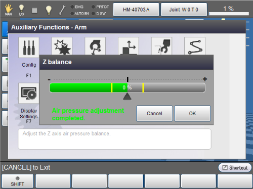 When you use an HM standard type robot, if the air pressure adjustment has not been completed, the Z balance window is displayed. Perform the air pressure adjustment.