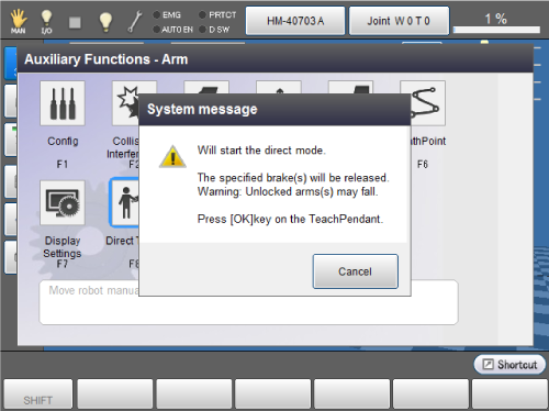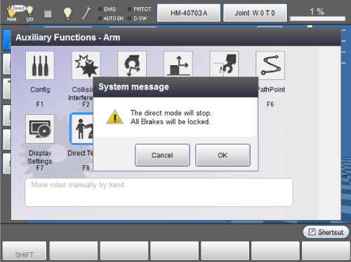 Pressing the [F8 Direct Teach] will display the system message. Once the system message appears, press the [OK] button on the teach pendant.