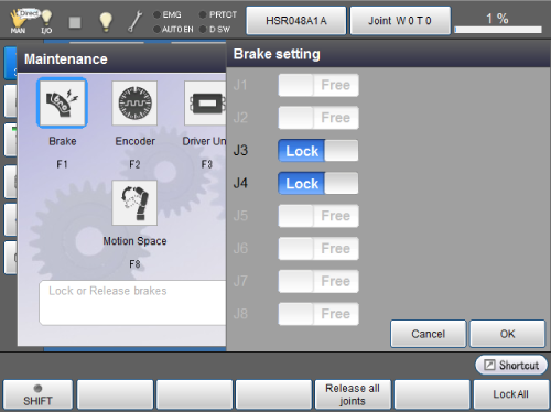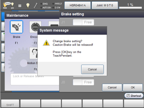 On the teaching pendant window, select an axis where you want to release the brake, and then press [OK], or press [F4 Release all joints]. The following system message will appear. While the system message is displayed, press the [OK] button on the teach pendant.