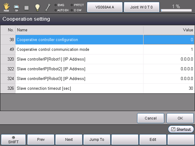 When the robot controller software version is 2.3.* or higher, 1: “Both Ethernet and EtherCAT (Defalt setting)" is set as a default. If you use Ethernet only, please change the value of the cooperative control communication mode to "0". |