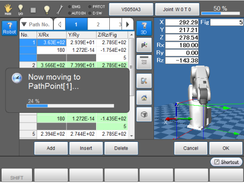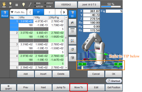 Pressing [Move To] displays [Mote To PathPoint] window. Select [PTP Movement] or [CP Movement (Linear)].