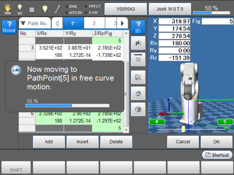 If the first and the last path points are the same position, or if the path goes through an identical path point twice or more with different robot posture, when you perform [F4: MoveTo] - [Move To PathPoint] - Free curve (Spline), the robot may move unexpected way.