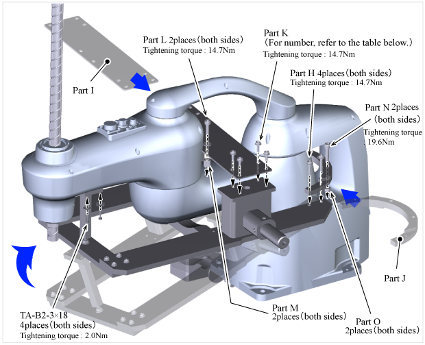 Fix the robot and the jig assembled in STEP 1 with bolts and the part I to O.