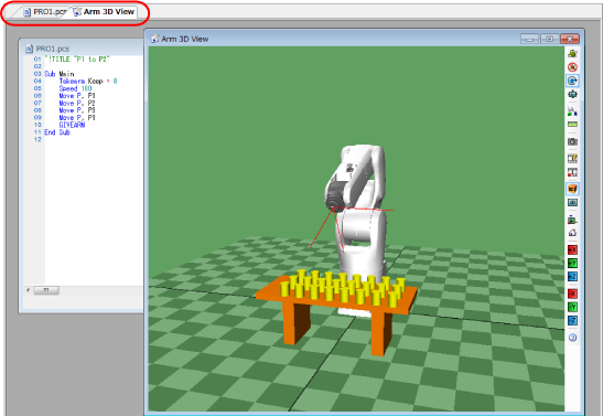 Client area displays Arm 3D View, Program Edit window, and log windows.