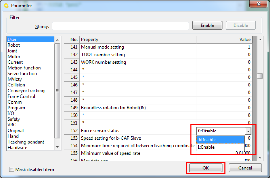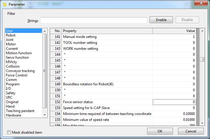 This function allows you to confirm or change parameters related to the robot and I/Os.