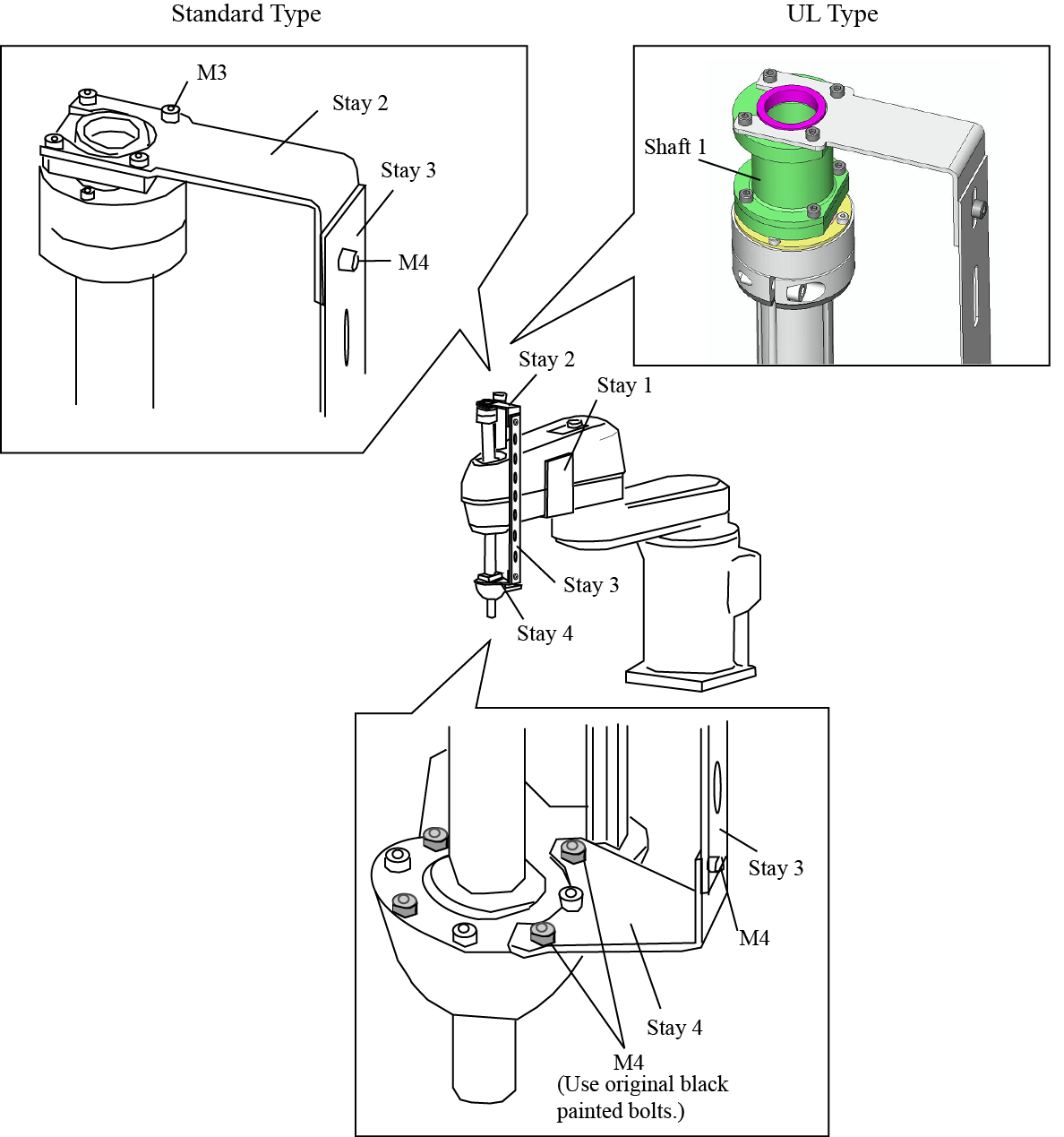 When preparing stays for clamping wiring and piping to the robot unit, refer to Stay 1 through Stay 4 shown below.