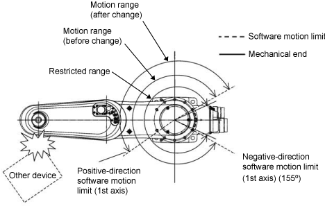 If the robot interferes with other devices or the air piping and wiring of the hand become taut as the robot arm moves, then change the software motion limits to make the motion space smaller as shown below.