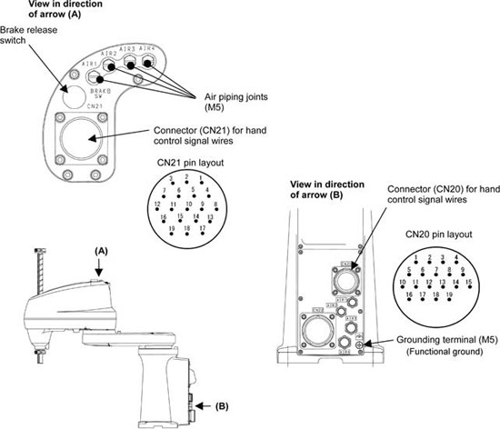 Note 1: Pins #1 to #19 on CN21 and those on CN20 are connected with each other. The maximum rated current per line is 1A. Note 2: Use the attached connector set for CN20 and CN21. |
