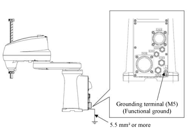 Ground the grounding terminal of the robot unit using a wire of 5.5 mm2 or more.