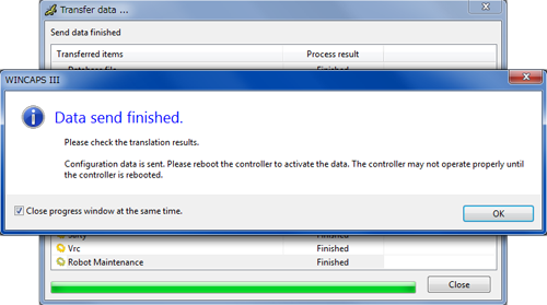 To transfer the arm data of the project from WINCAPSIII to the robot controller, choose Connect | Transfer data.