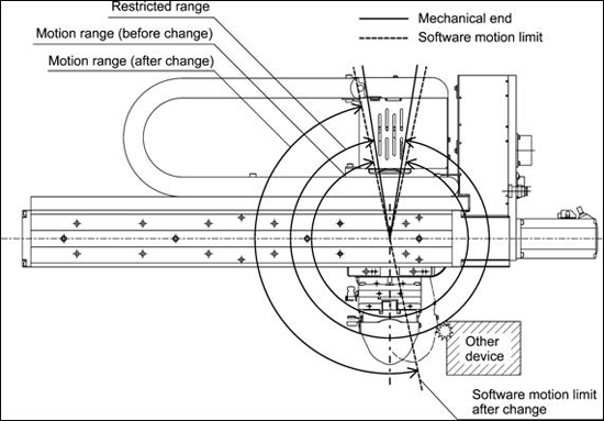 When changing software motion limits, be sure to check the mechanical stop positions. Configure the setting so that the robot arm can move without interfering with the mechanical stoppers.