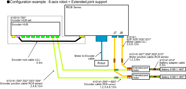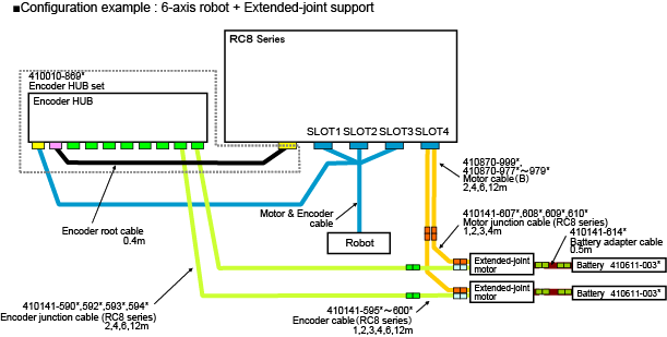 - The robot controller and extended-joint motors are connected using extended-joint motor cables, motor conversion cables, encoder cables, and encoder backup batteries (all of these are options).