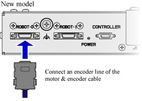 If you use a new model, connect the encoder line of the motor & encoder cable to the encoder hub's connector port indicated as "ROBOT-0" (on the left side viewed from the front).