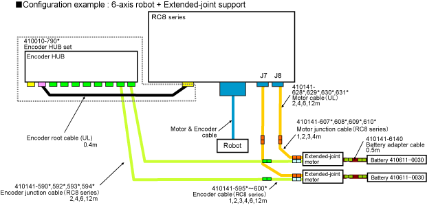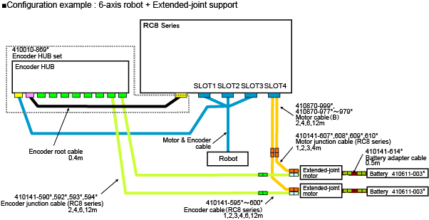 To prevent miswiring of extended-joint motors, attach the labels that come with a set of extended-joint cables to those cables. - Controller, Cable and Cable connector parts are not dust-& splash-proof. If you use them in any environments where the ingress of dust or liquid may occur, please take appropriate ingress prevention measures.