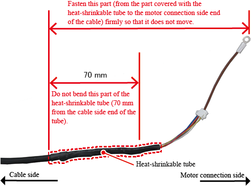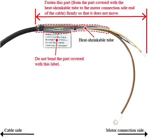 For the Extended-joint, the total length of the motor cable of all axes on the Extended-joint is 48m. The maximum length of the Motor & Encoder cable is 12m. For the MC8, the total length of all axes is 96m a the maximum. - The bending radius for the encoder cable and encoder relay cable should be 12.5 mm or more for the fixed cable, and 83 mm or more for the movable cable. The bending radius for the motor cable and the motor relay cable should be 13.5 mm or more for the fixed cable, and 90 mm or more for the movable cable. Excessive bending will damage the cable.