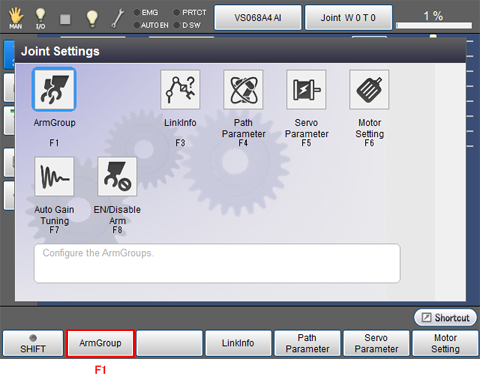 Operation path: Top screen-[F2 Arm]-[F12 Maintenance]-[F10 Joint Settings]-[F1 ArmGroup]