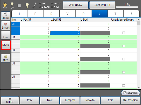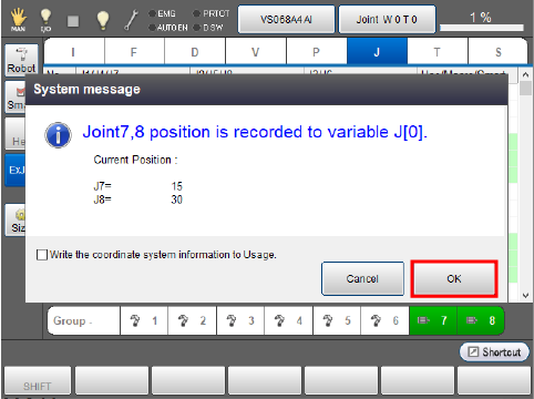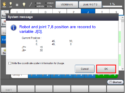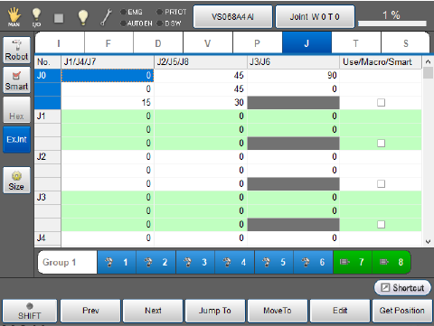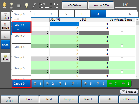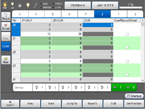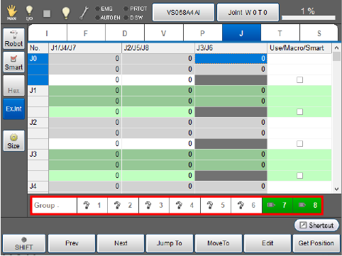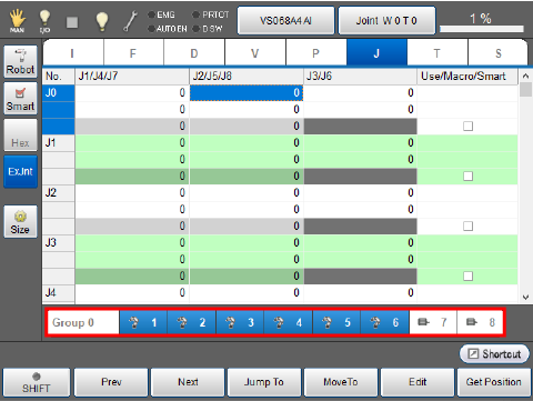 In obtaining target positions, registering robot joints and extended-joints in the same arm group enables you to store the current robot joint position data in P-type variables and only the current extended-joint position data in the same J-type variable number at the same time.