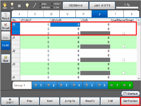 In obtaining target positions, registering robot joints and extended-joints in the same arm group enables you to store the current position data of the robot joints and the extended-joints in the same variable number at the same time.