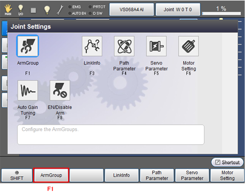 Top Screen — [F2 Arm] — [F12 Maintenance] — [F10 Joint Settings] - [F1 Arm Group]