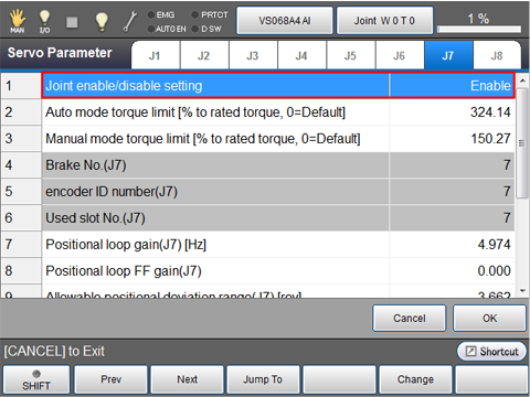 Operation path : Top screen -[F2 Arm]-[F12 Maintenance]-[F7 Joint Settings]-[F5 Servo Parameter]