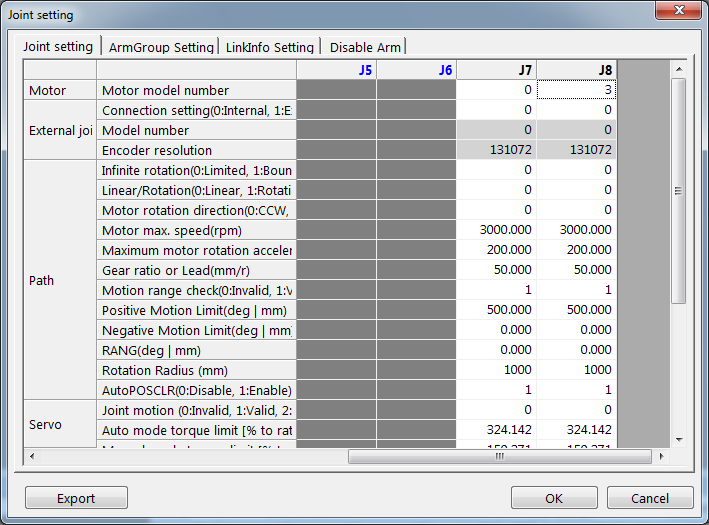 This tab allows to confirm and check extended-joint-related setting values, such as model number, motion range.